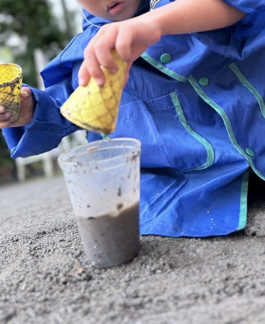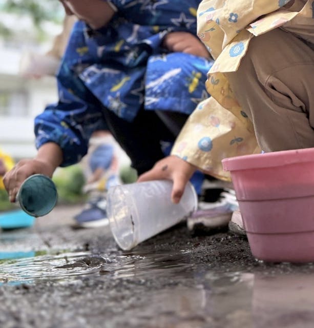 雨の日にしか見られない景色が広がる中、水たまりですくった水を土にかけ、それが吸い込まれる様子を夢中で観察するなど、集中して繰り返し遊び込んでいました。