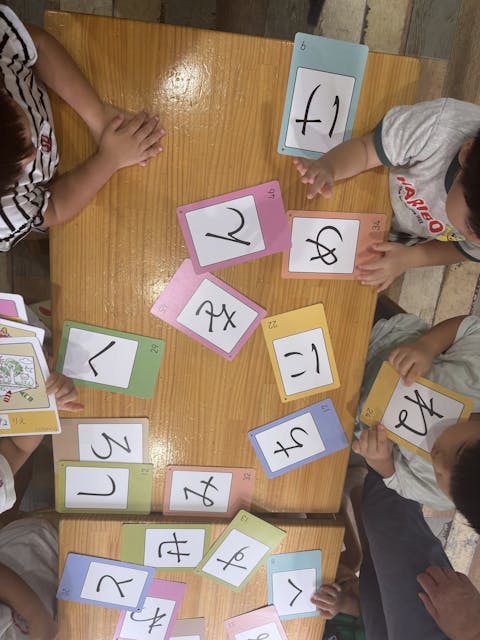 先生が問いを出すと、いい緊張感が走ります。僅差で他のお友だちに取られてしまっても落ち着いて「次がんばろ!」と気持ちを切り替える場面も見られ、自分のペースを大事にできています。